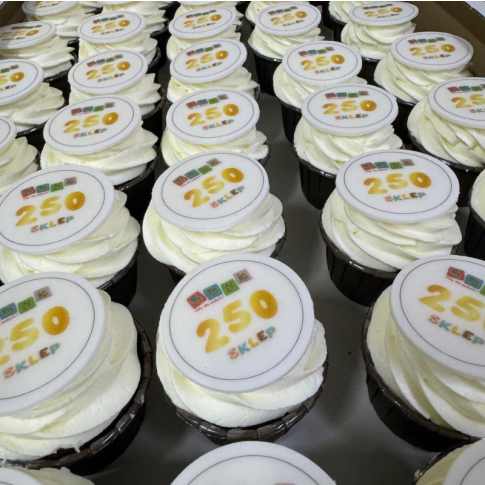 Każda babeczka dekorowana jest wysokim „wirkiem” kremu, na którym umieszczamy okrągły opłatek z indywidualnym nadrukiem. Dzięki temu całość wygląda profesjonalnie i spójnie z identyfikacją wizualną marki. To świetny sposób, by wyróżnić swoją firmę podczas: