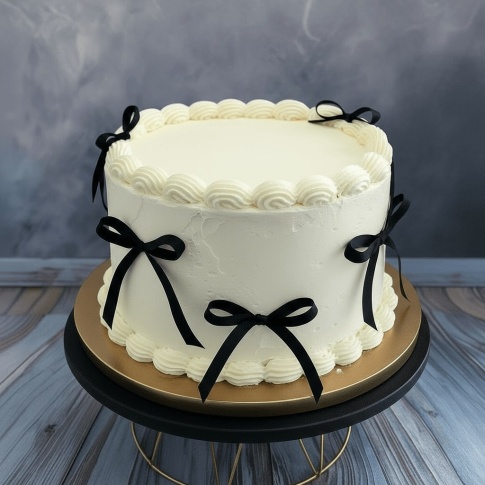 Ten biały tort udekorowany czarnymi kokardkami to doskonały wybór dla osób szukających deseru, który łączy w sobie prostotę i wyrafinowanie. Jego subtelne zdobienia sprawiają, że tort idealnie pasuje na śluby, zaręczyny, chrzciny, a także eleganckie przyjęcia rodzinne. Dzięki estetycznej formie tort pięknie prezentuje się na zdjęciach, stając się efektowną ozdobą stołu. To propozycja dla miłośników klasycznego stylu i ponadczasowej elegancji.