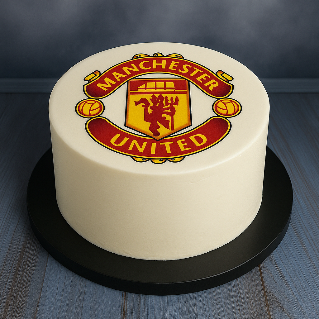 Elegancki tort w białym kremie z opłatkiem przedstawiającym herb Manchester United. Idealny prezent urodzinowy dla kibica Czerwonych Diabłów i fana Premier League.