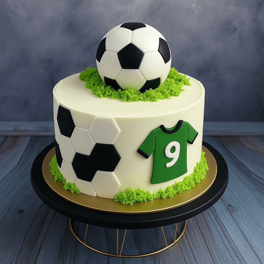 Tort piłkarski to idealny wybór dla każdego fana futbolu! Biały tort ozdobiony czarno-białymi elementami przypominającymi piłkę, zieloną trawką z kremu oraz dekoracją w formie koszulki sportowej z numerem – to prawdziwa gratka dla małych i dużych kibiców. Doskonały na urodziny, imprezy sportowe czy tematyczne przyjęcia. Ten tort z piłką nożną nie tylko pięknie wygląda, ale również smakuje wyśmienicie, sprawiając radość wszystkim gościom.